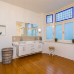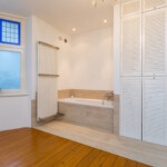 Authentic wooden stairs give access to the 1st floor with large luxurious bathroom (4.4m x 4.2m) with very spacious double shower (1.0m x 1.5m), bath, two sinks and wall cabinets with plenty of storage. A separate toilet and large bedroom (4.4m x 4.2m)